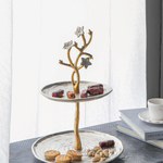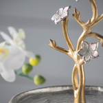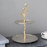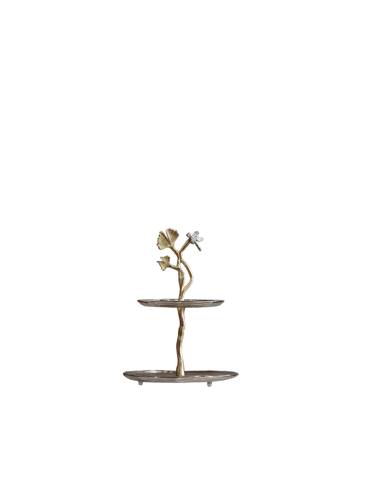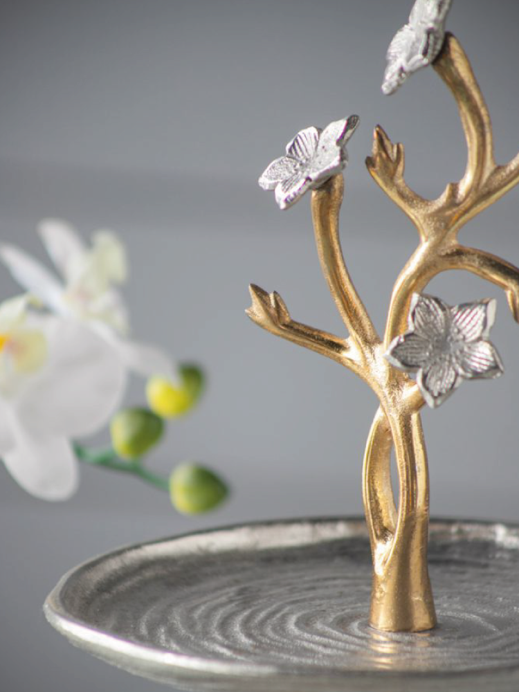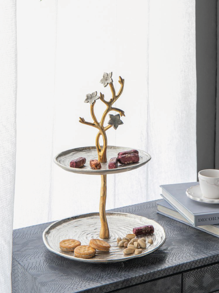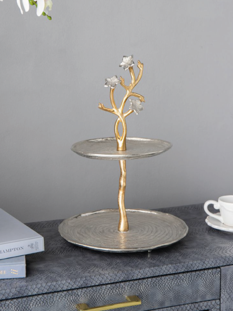 Este es un elegante y versátil soporte de dos niveles, inspirado en la delicada belleza de las flores de cerezo, diseñado para convertirse en una pieza central en cualquier hogar. El cuerpo del soporte simula una rama retorcida con un acabado de dos tonos que sostiene dos amplias bandejas redondas. Además, está adornado con tres delicadas flores plateadas en la parte superior. Con detalles escultóricos y un diseño orgánico, esta pieza complementa estilos Art Decó, moderno y de transición. Es perfectamente adecuado para organizar y exhibir objetos pequeños como tarjetas, llaves, perfumes o joyas, aportando sofisticación sin esfuerzo a cualquier rincón, desde la cocina hasta el dormitorio o el comedor.