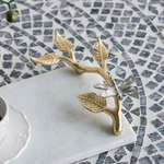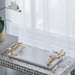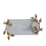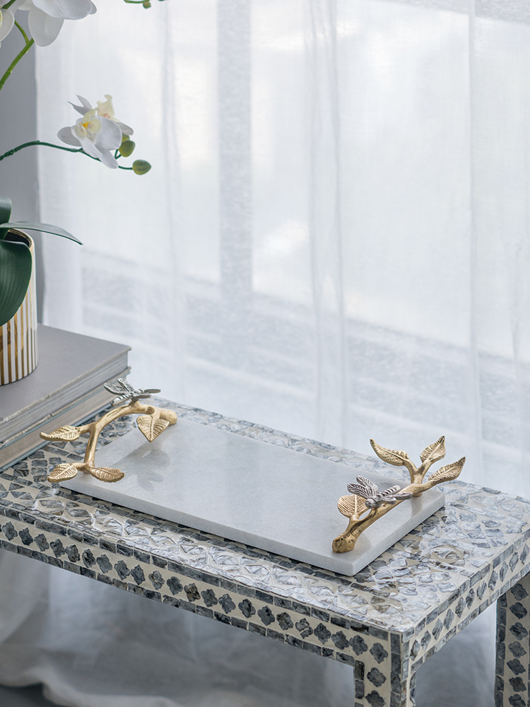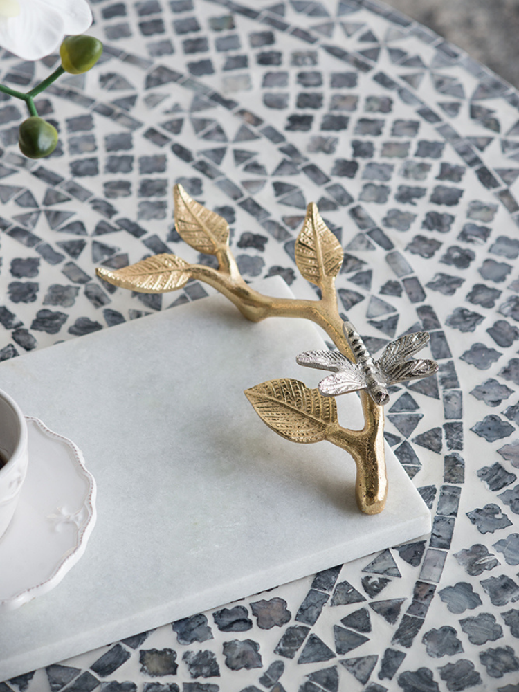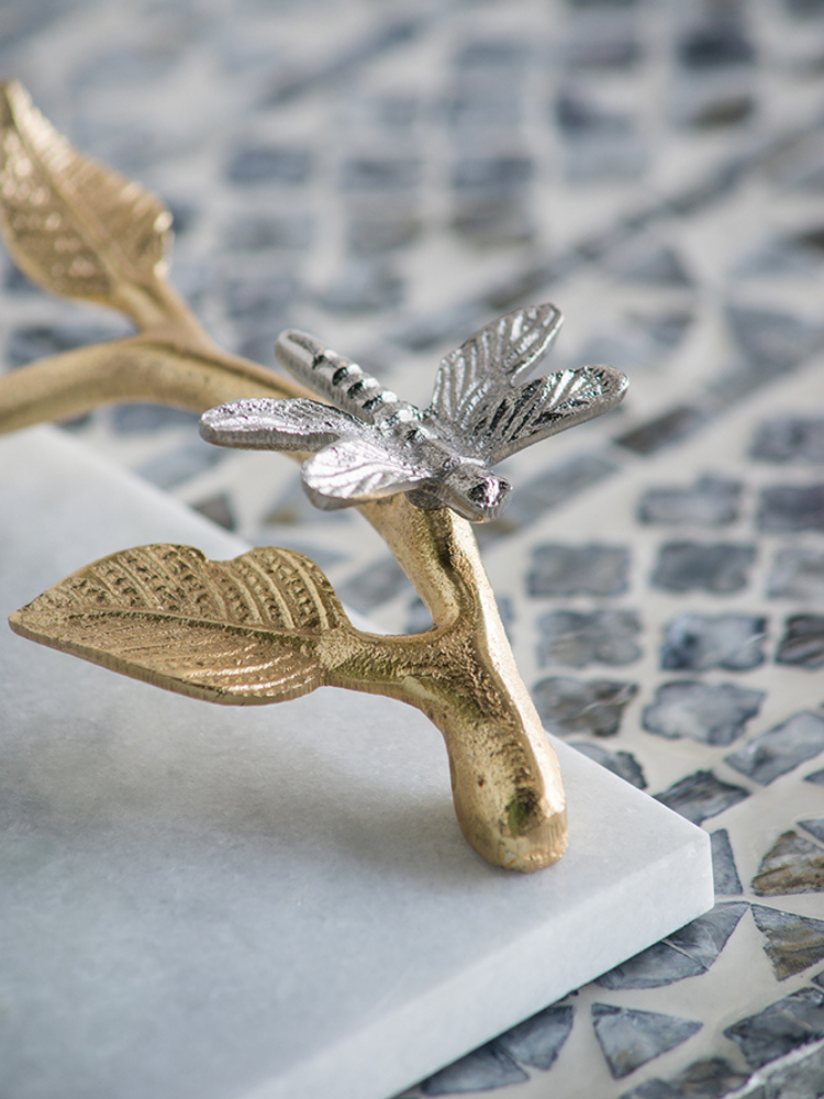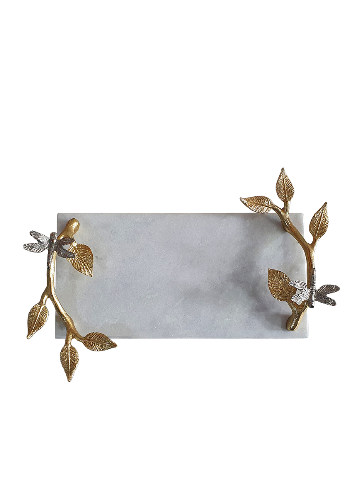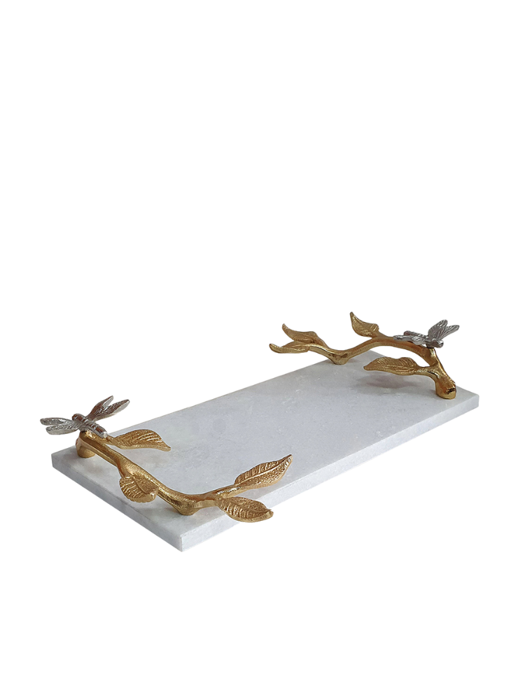 Esta es una elegante y moderna bandeja de mármol con un diseño caprichoso. Presenta una base de mármol blanco enmarcada por asas de ramas doradas con textura y adornada con dos libélulas plateadas y doradas juguetonas, lo que le confiere un toque de sofisticación botánica. Es el tamaño ideal para servir aperitivos, exhibir ornamentos llamativos o mantener organizados los artículos de un tocador, y su diseño versátil complementa sin esfuerzo estilos que van desde el Art Decó hasta el contemporáneo y bohemio.