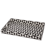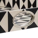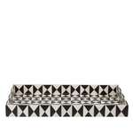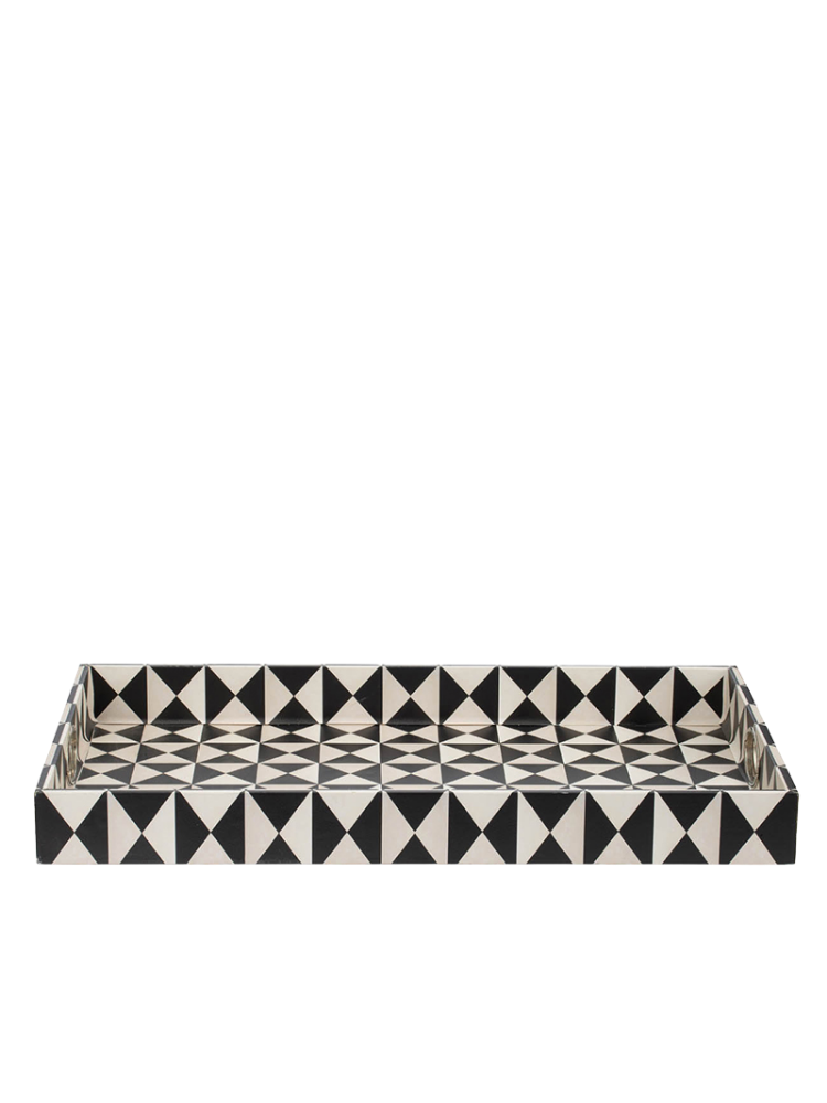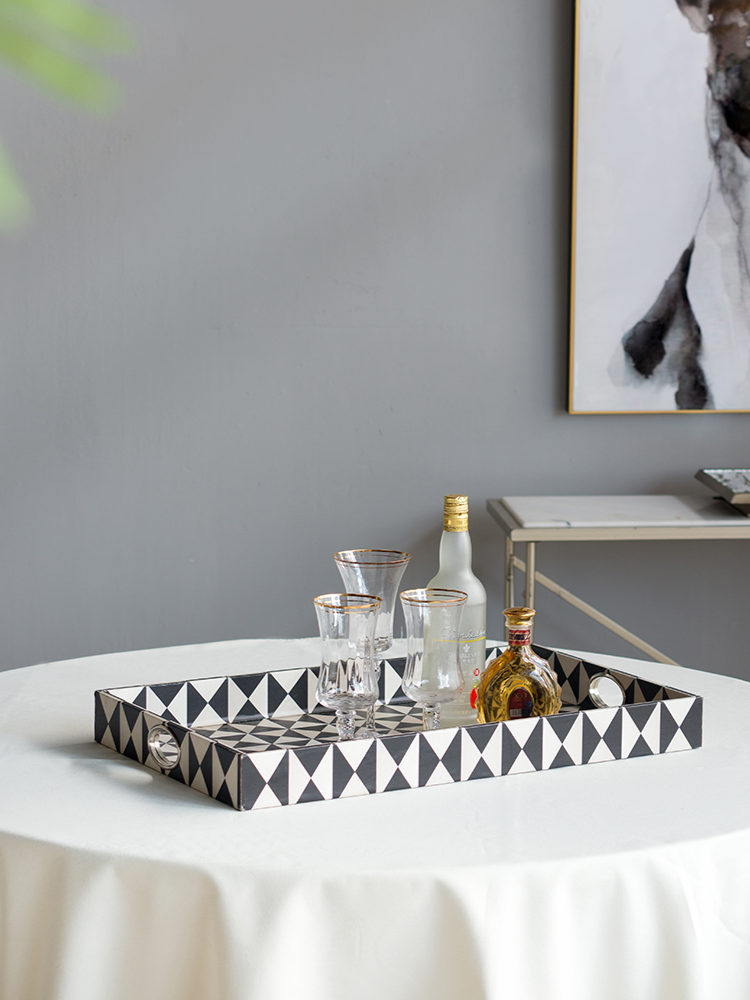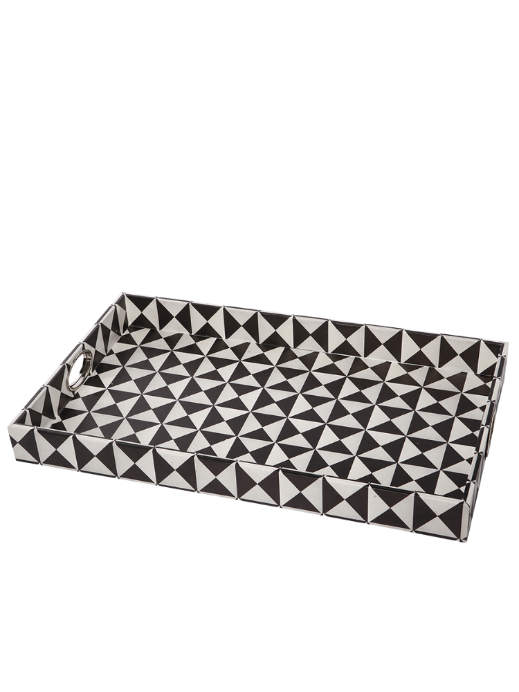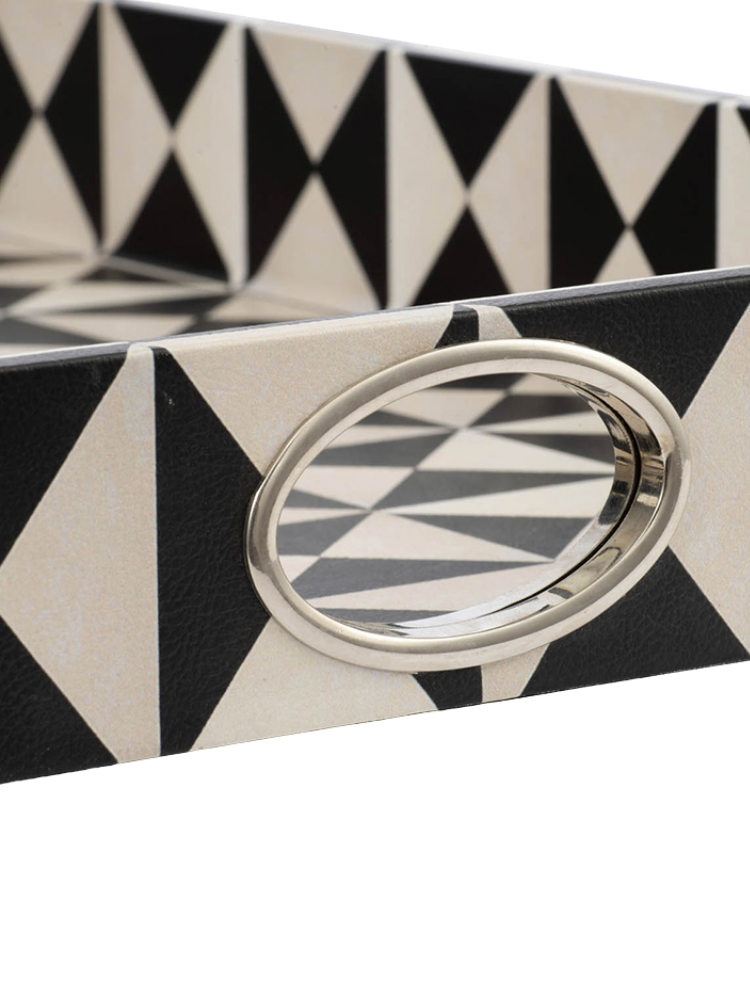 Esta bandeja rectangular decorativa irradia un estilo Art Decó audaz gracias a su llamativo patrón geométrico. El diseño se compone de un fuerte contraste de triángulos o rayos en blanco y negro, creando un efecto visual dinámico y moderno. Al igual que su compañera, presenta asas de corte redondo para un fácil manejo y está construida con MDF duradero y un recubrimiento de PU resistente a la humedad. Su tamaño y diseño la hacen perfecta para servir cócteles o como pieza central destacada en una sala de estar o recibidor.
