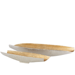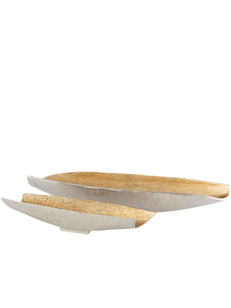 Este juego de dos cuencos decorativos, que se venden como un set, presenta un diseño elegante y orgánico. Ambos cuencos tienen una forma alargada, similar a una canoa, y están fabricados en aluminio con un acabado dorado antiguo. La superficie interior tiene una textura que evoca el follaje o la paja, con un acabado dorado, mientras que la parte exterior es lisa y plateada, creando un contraste visual muy atractivo.