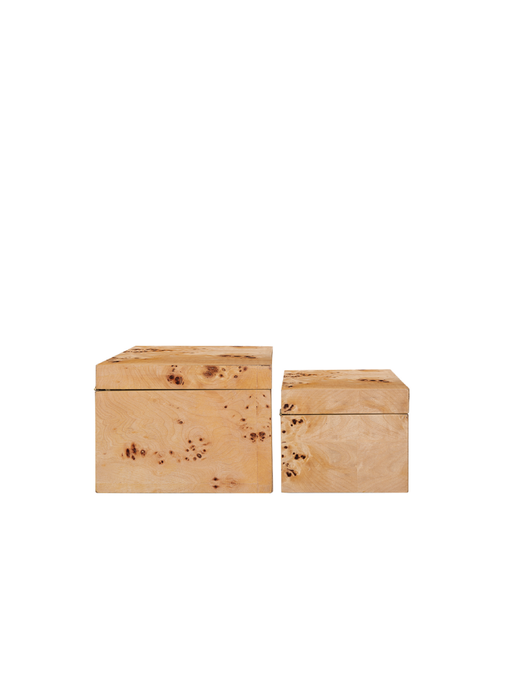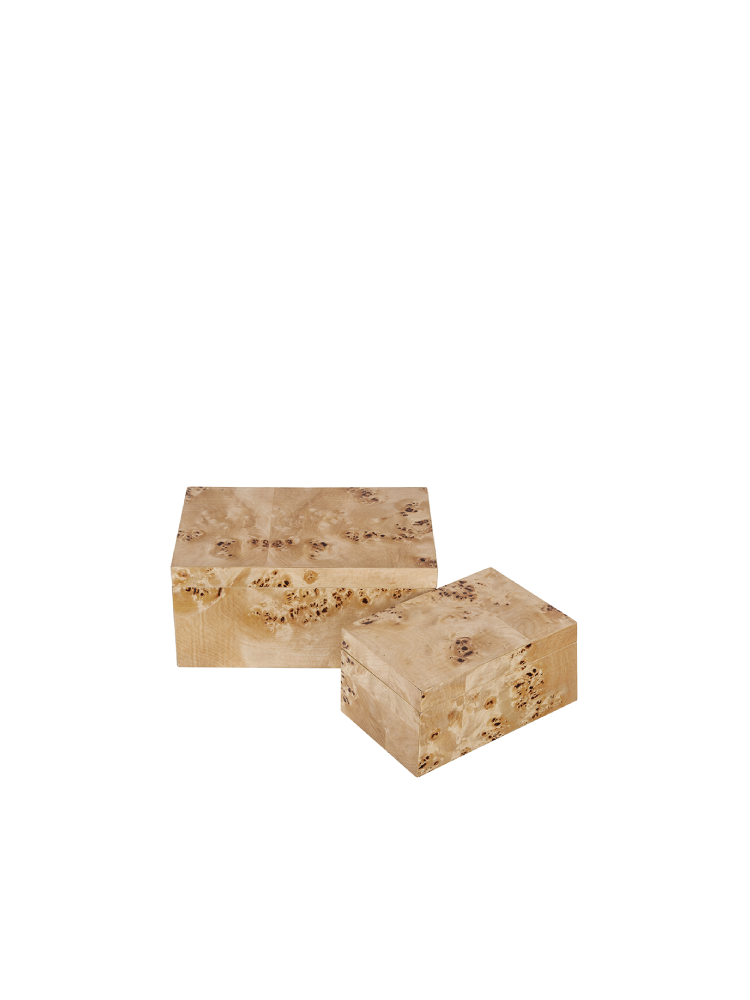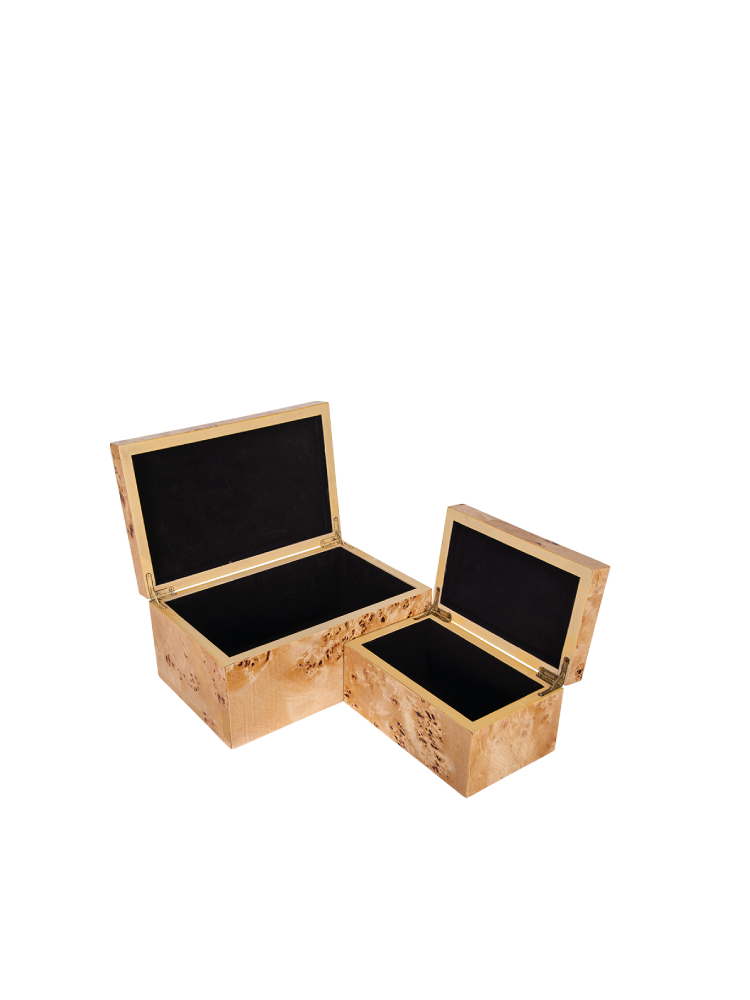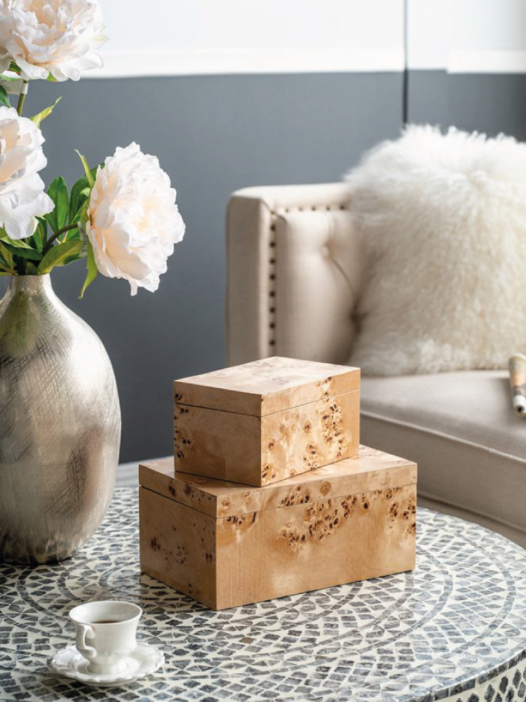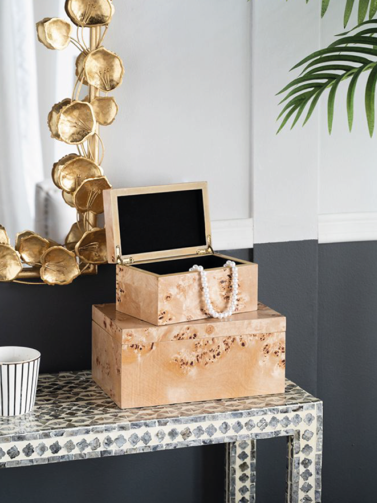 Nuestro set de dos cajas decorativas de madera enchapadas en raíz ofrece una combinación perfecta de elegancia y funcionalidad. Estas cajas son ideales para organizar y almacenar tus objetos más preciados, al mismo tiempo que añaden un toque de estilo a tu decoración. El enchape de raíz agrega un aspecto lujoso y único a cada caja, destacando su belleza natural.