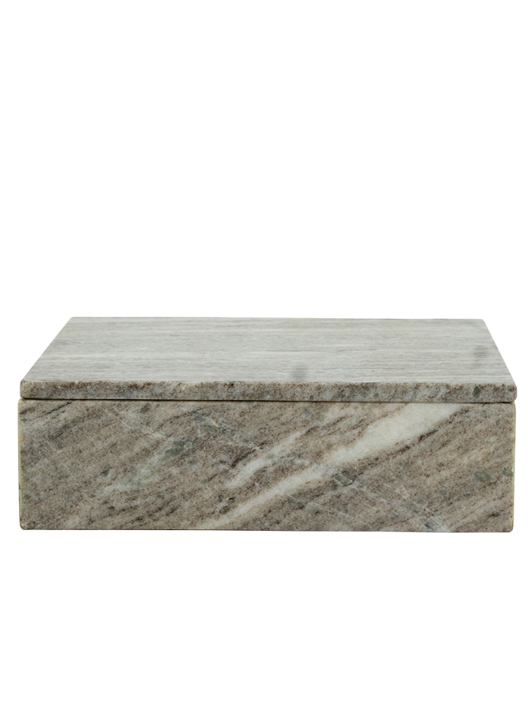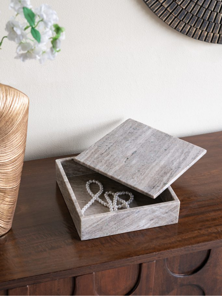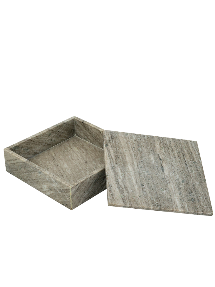 Esta caja decorativa de almacenamiento infunde un diseño orgánico con un toque de minimalismo moderno. La pieza presenta una silueta cuadrada y elegante, completamente elaborada en mármol 100%. Destaca por su acabado pulido gris y su sutil veteado natural, que le confiere una belleza discreta y atemporal. Su diseño simple, de líneas limpias, y su acabado pulido le permiten complementar estilos tradicionales, contemporáneos, wabi-sabi e industriales. Ya sea utilizada para guardar pequeños tesoros, esenciales del hogar o joyas, esta caja elevada y elegante se integrará sin esfuerzo en la decoración de su sala de estar, entrada, dormitorio u oficina.