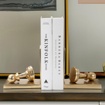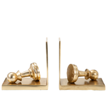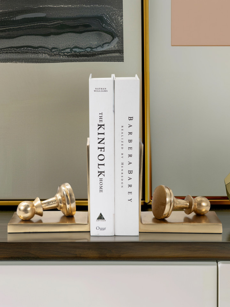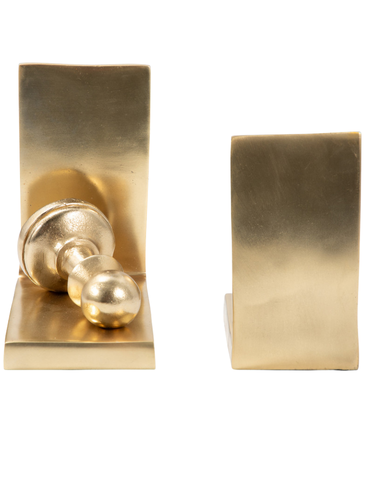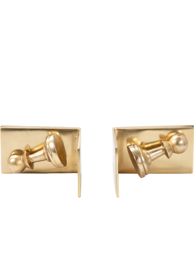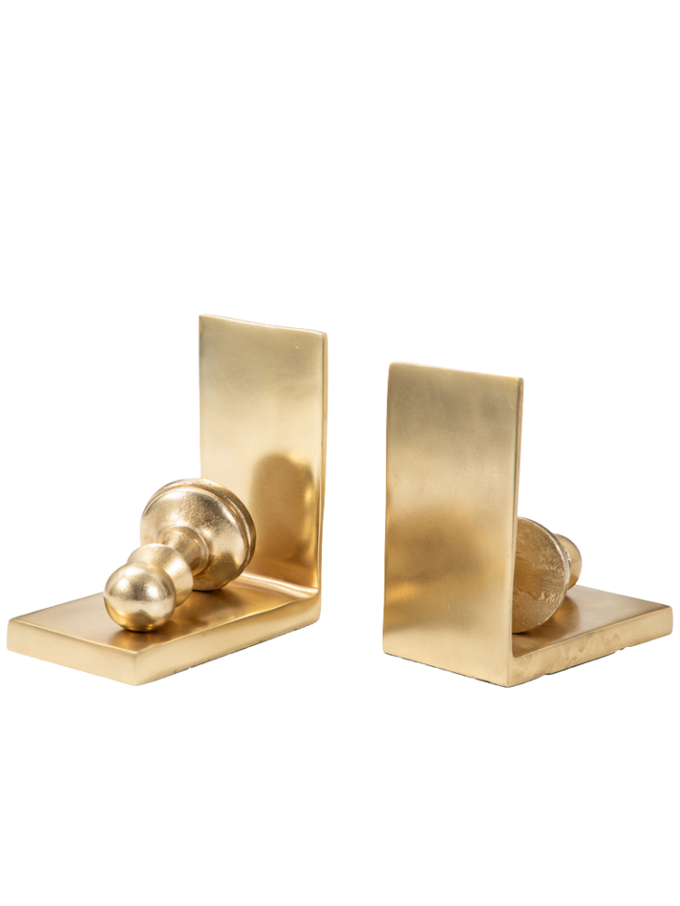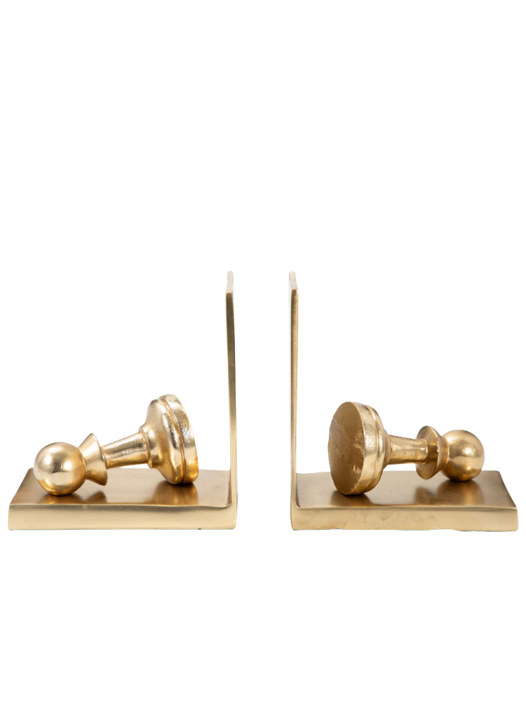 Estos sujetalibros, que combinan elegancia y funcionalidad, están inspirados en las piezas del ajedrez. Su diseño presenta un peón de metal con un acabado dorado mate, que se apoya en una base rectangular con un sujetalibros vertical. El juego de dos piezas es perfecto para mantener los libros ordenados en cualquier estantería, escritorio o mesa, añadiendo un toque distintivo y un aire intelectual a tu decoración.