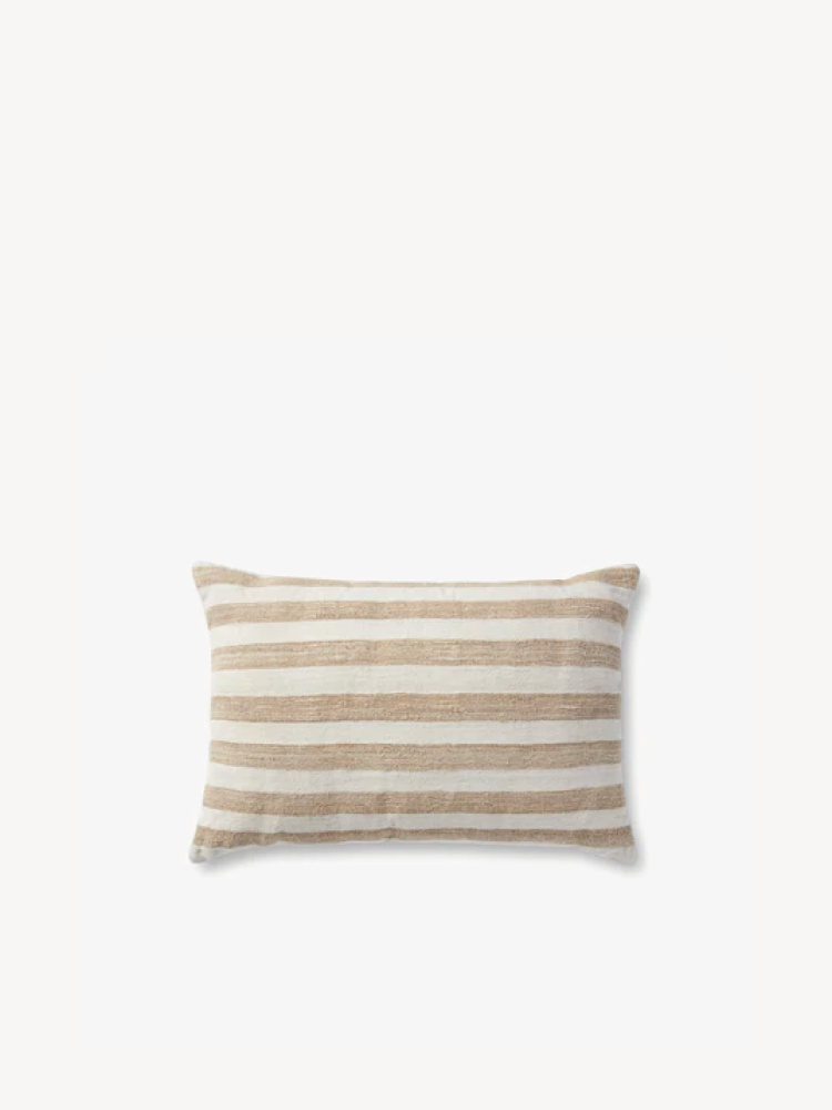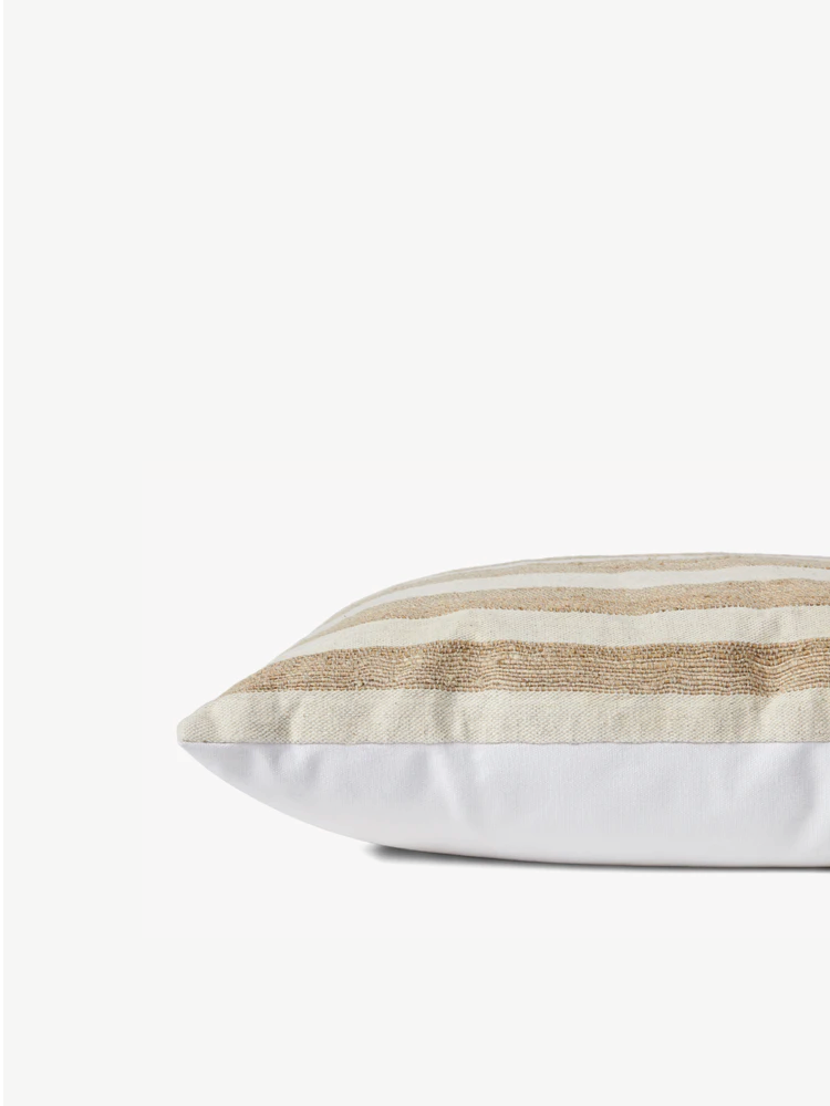 Este cojín rectangular de formato pequeño presenta un fondo en tono marfil adornado con líneas en colores beige.