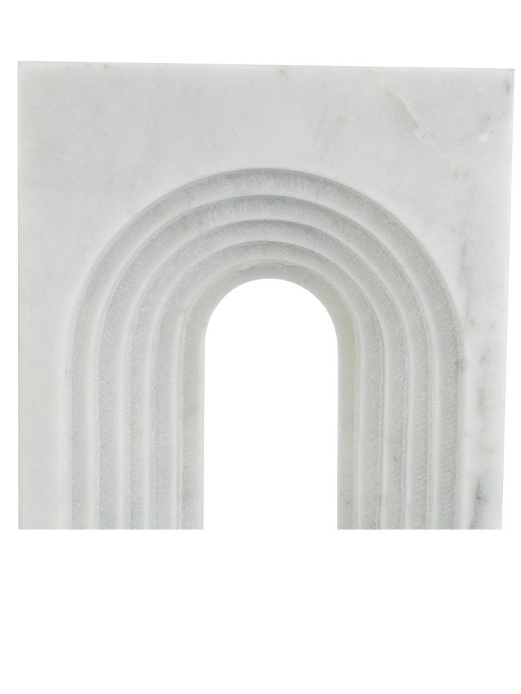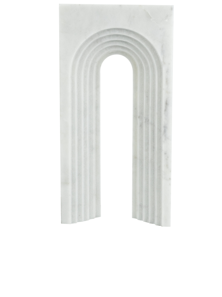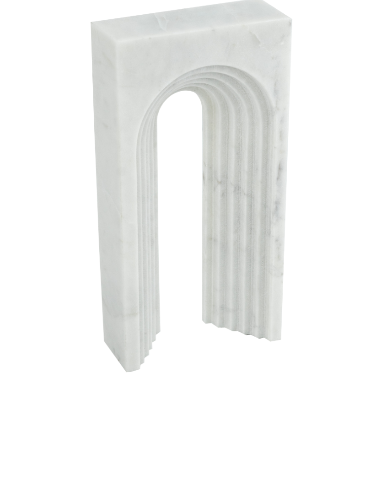 Esta escultura decorativa es un homenaje a la arquitectura romana atemporal, transformando la icónica forma del arco en una pieza de arte compacta y moderna. Está elaborada con mármol blanco auténtico en una forma orgánica y fluida.
