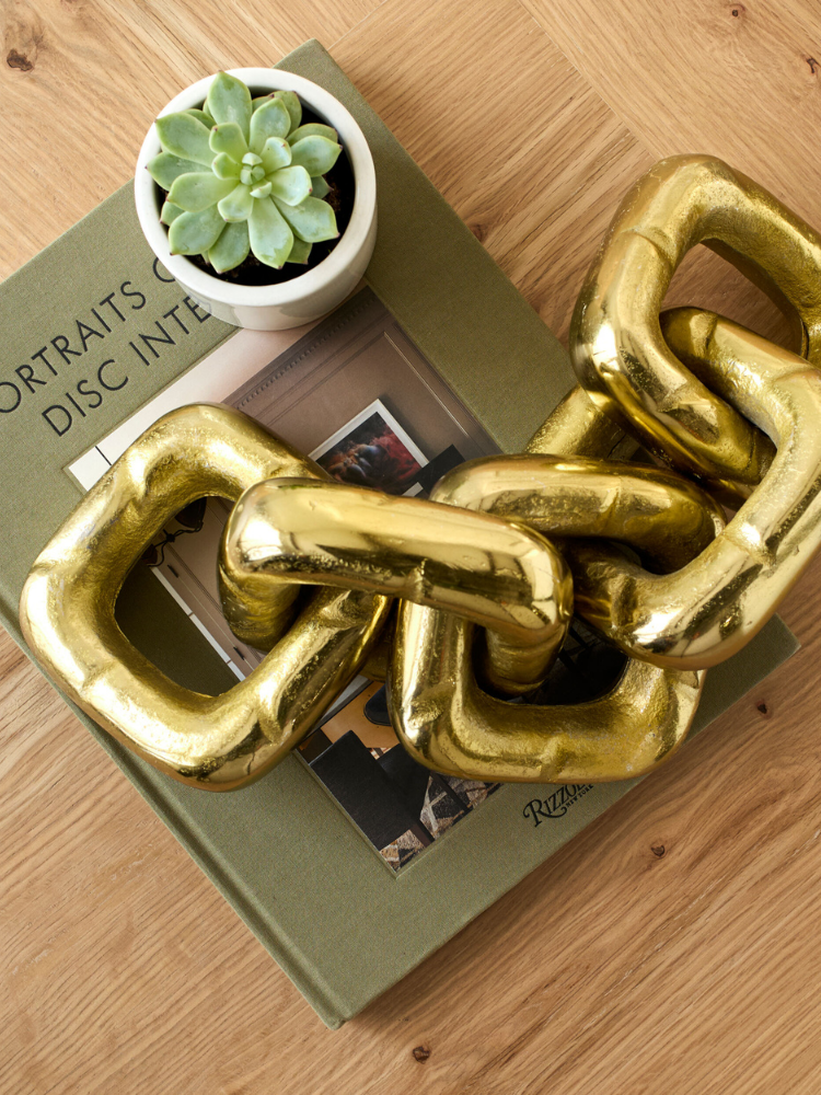 Esta escultura decorativa presenta un diseño moderno y minimalista, que evoca una cadena o eslabones entrelazados. La pieza está hecha de aluminio con un recubrimiento en polvo de color dorado, lo que le da una textura brillante y un acabado elegante. Sus curvas suaves y su forma entrelazada crean un interés visual que la convierte en un acento perfecto para mesas de centro, estanterías o escritorios. La escultura es un complemento versátil que añade un toque de sofisticación a cualquier espacio.