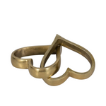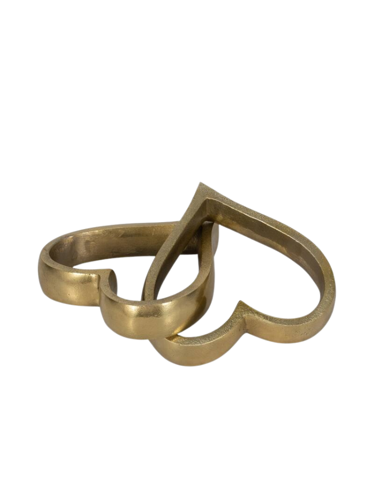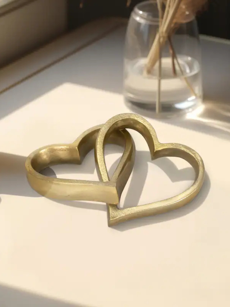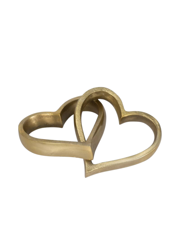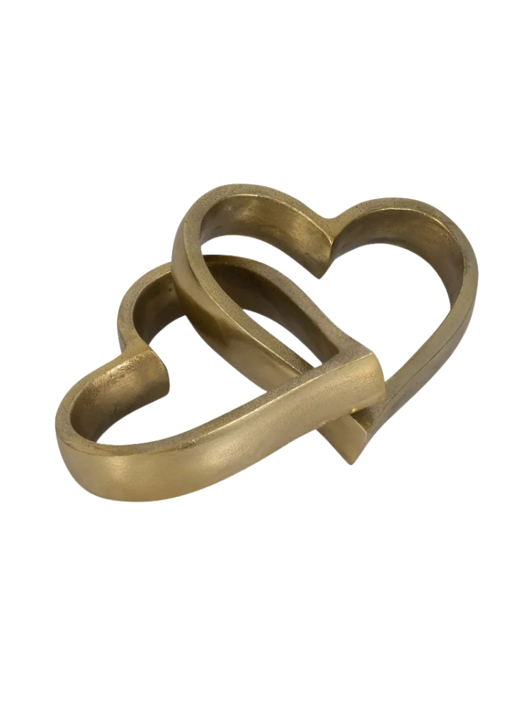 En la imagen se muestra un objeto decorativo con la forma de dos corazones entrelazados. La pieza es de metal y tiene un acabado en color dorado. Los corazones están unidos entre sí de una manera que crea una sensación de continuidad y conexión.