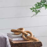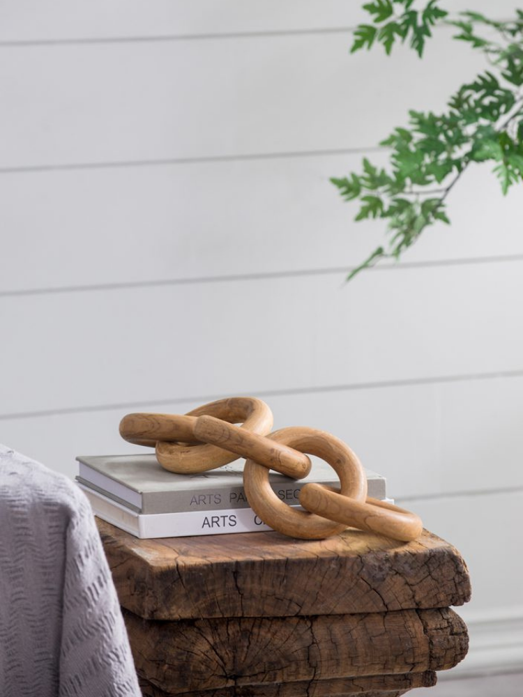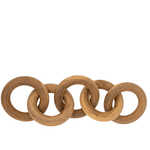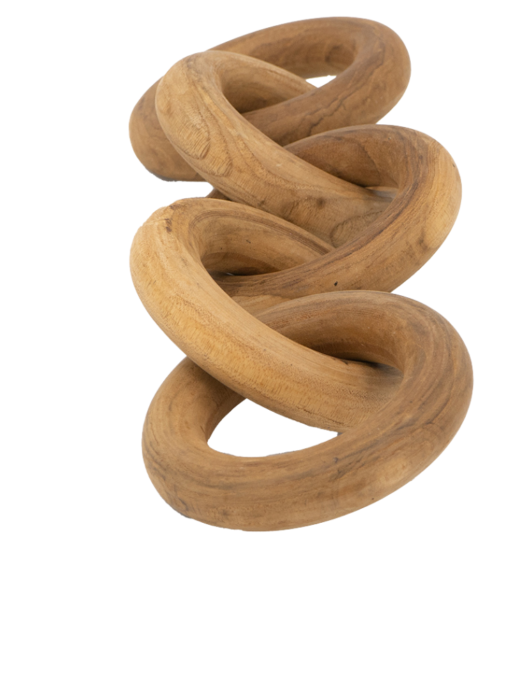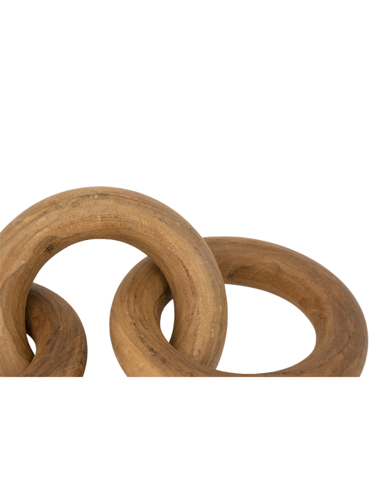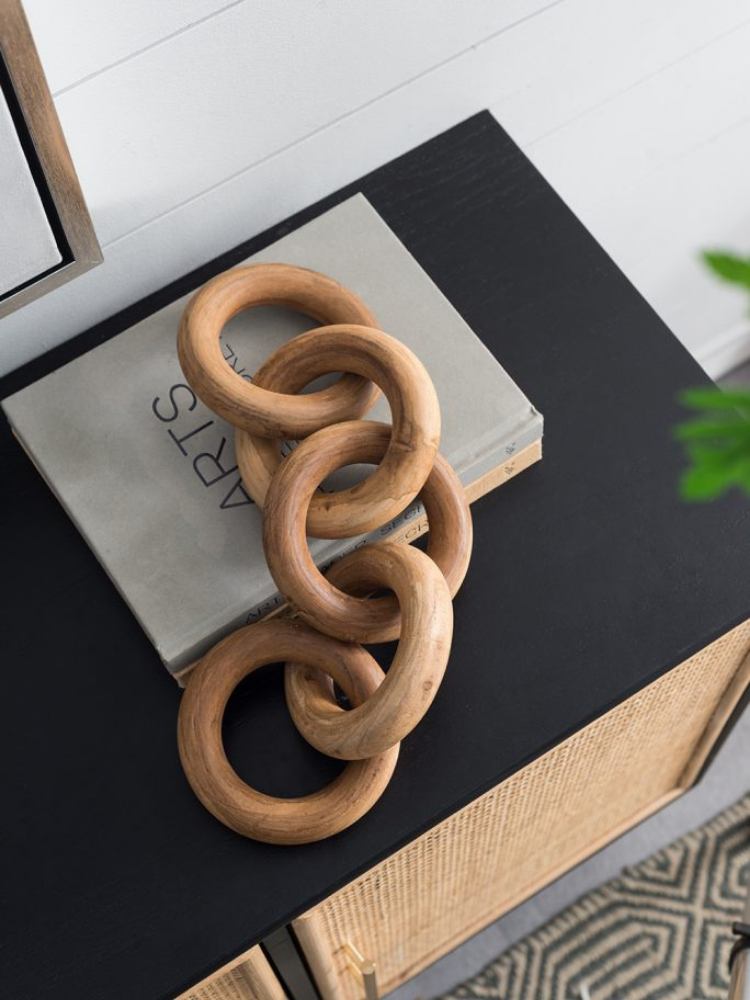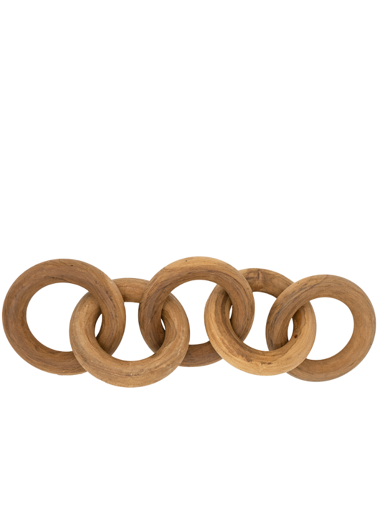 Esta pieza es una moderna y minimalista escultura de cinco eslabones de cadena elaborada 100% en madera de teca con un hermoso tono natural y suave. Cada eslabón ha sido tallado a mano en una forma circular pulida, añadiendo un toque de calidez y artesanía. Su diseño atemporal de líneas limpias permite que esta escultura se integre sin esfuerzo en una amplia variedad de estilos de interior, complementando perfectamente decoraciones boho, tradicional, nórdicas o farmhouse. Es el acento ideal para tu mesa, aparador, repisa o cualquier lugar que necesite un toque de elegancia natural.