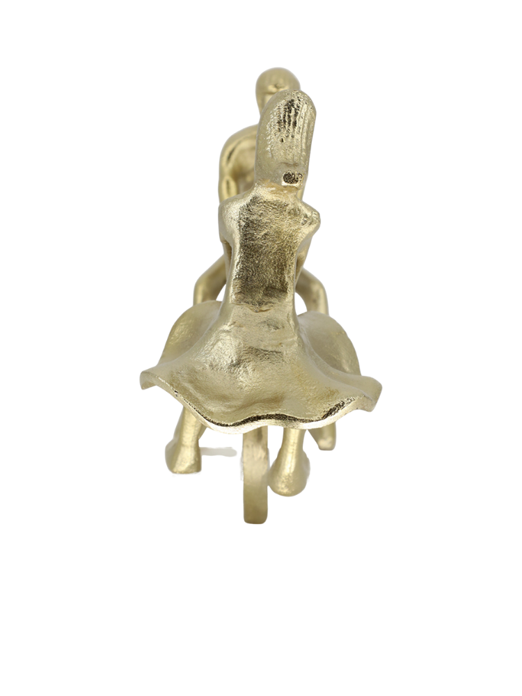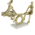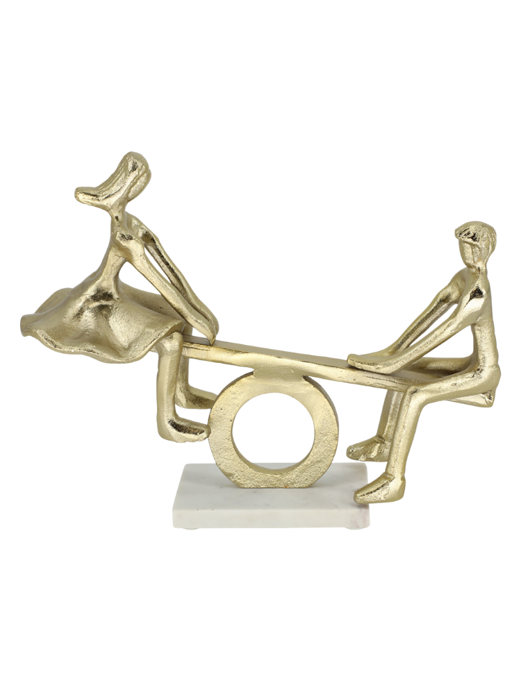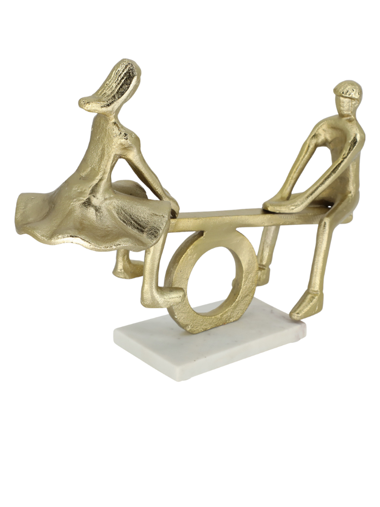 Esta moderna escultura de metal representa a una pareja sentada en un balancín. Su diseño minimalista y lineal está bañado en un acabado dorado, que le da un toque de elegancia y sofisticación. Esta pieza es ideal para añadir un elemento artístico y un punto de luz a cualquier espacio, como una repisa, una mesa de centro o una estantería, convirtiéndola en un acento decorativo que evoca la alegría, el equilibrio y la conexión entre dos personas.