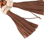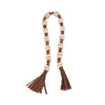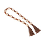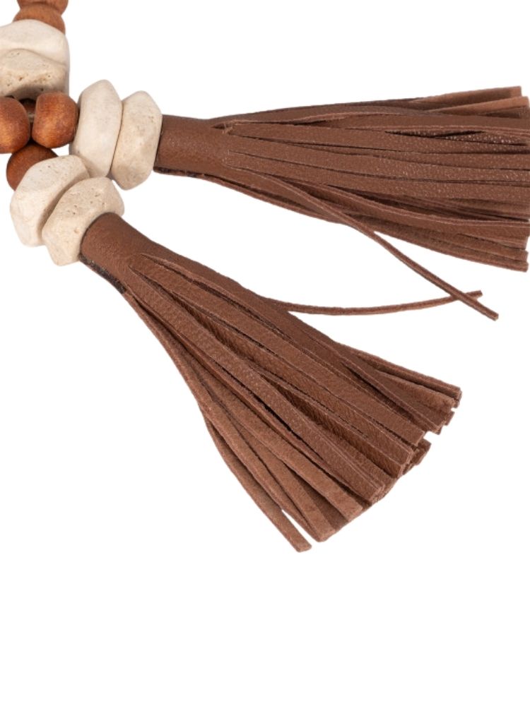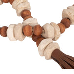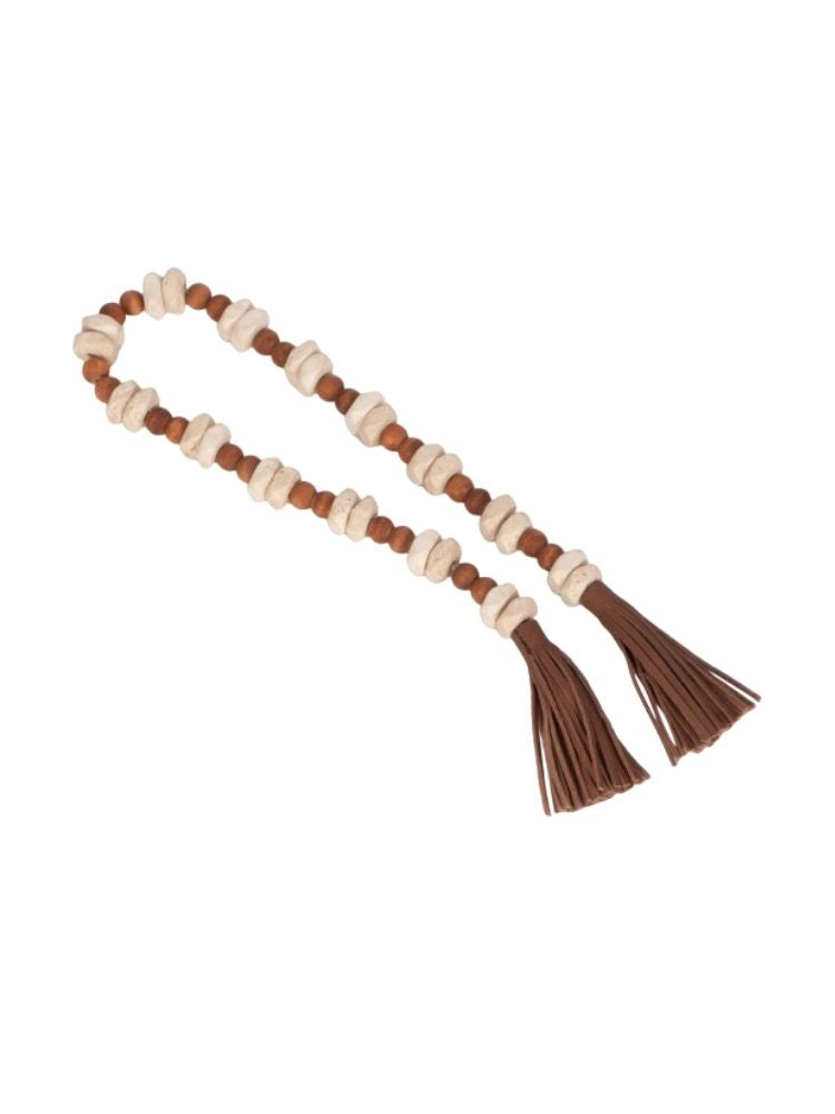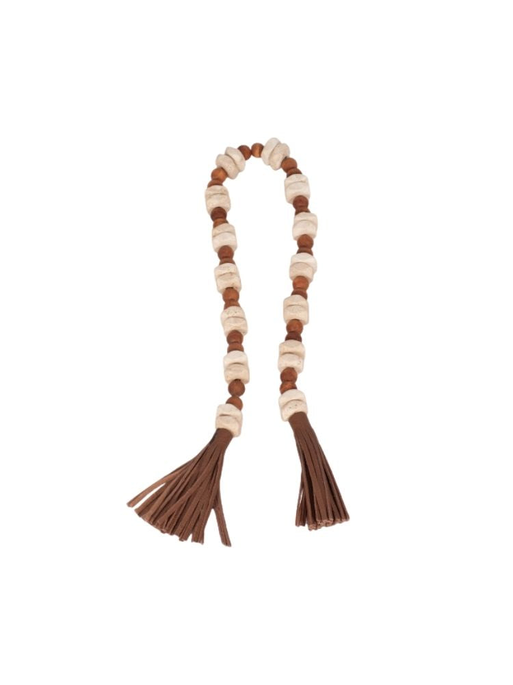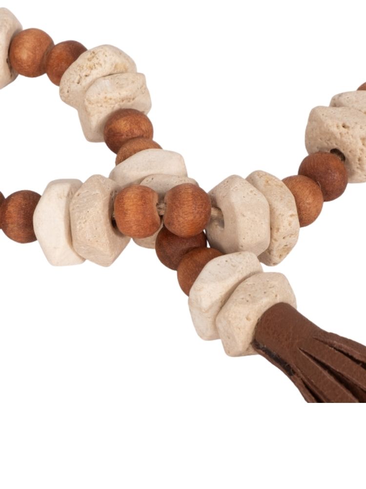 Esta pieza es un elegante y versátil guirlanda de cuentas decorativas, diseñado para añadir un toque rústico y natural a cualquier rincón de tu hogar. La pieza está compuesta por una larga sarta de cuentas de diferentes tamaños y texturas. Las cuentas más grandes, de un color claro y un acabado liso, parecen ser de madera de tono natural, mientras que las cuentas más pequeñas y oscuras tienen una forma cilíndrica y un aspecto veteado, que se asemeja al travertino. El conjunto está ensartado en un cordón de imitación de cuero de color marrón oscuro que le da un toque orgánico y artesanal. Para un acabado más sofisticado, ambos extremos del rosario están adornados con borlas grandes y voluminosas, hechas del mismo material que el cordón.
