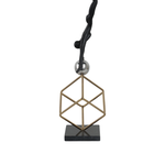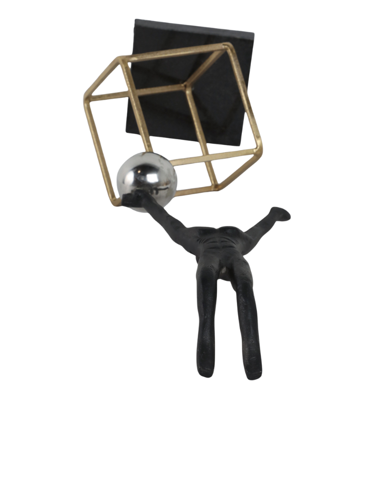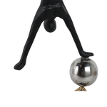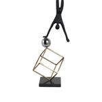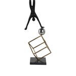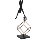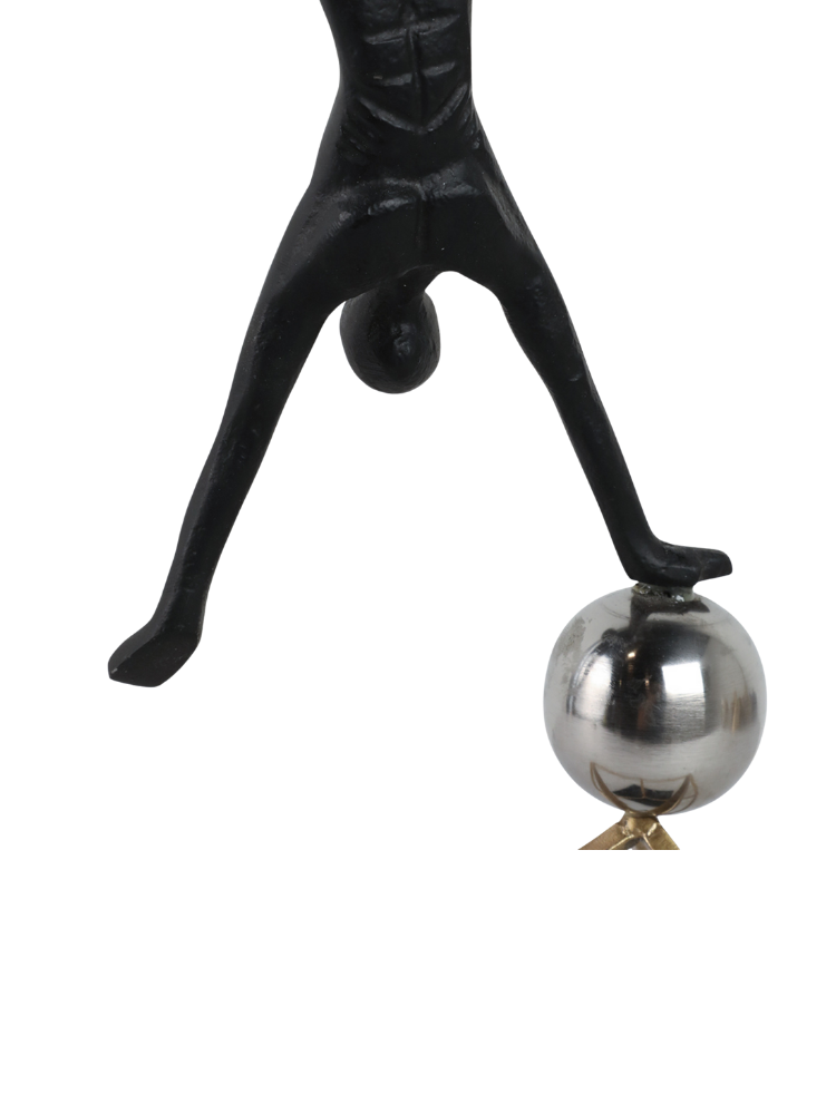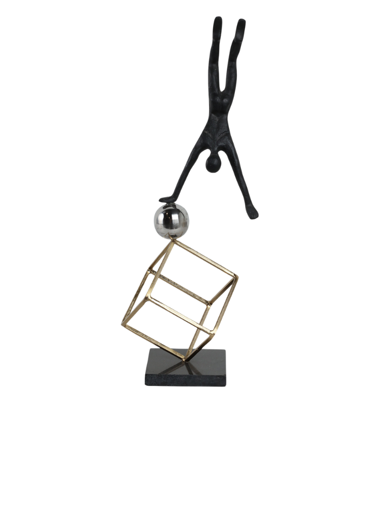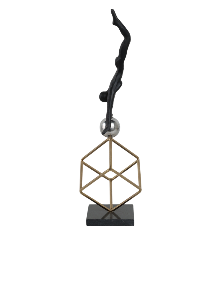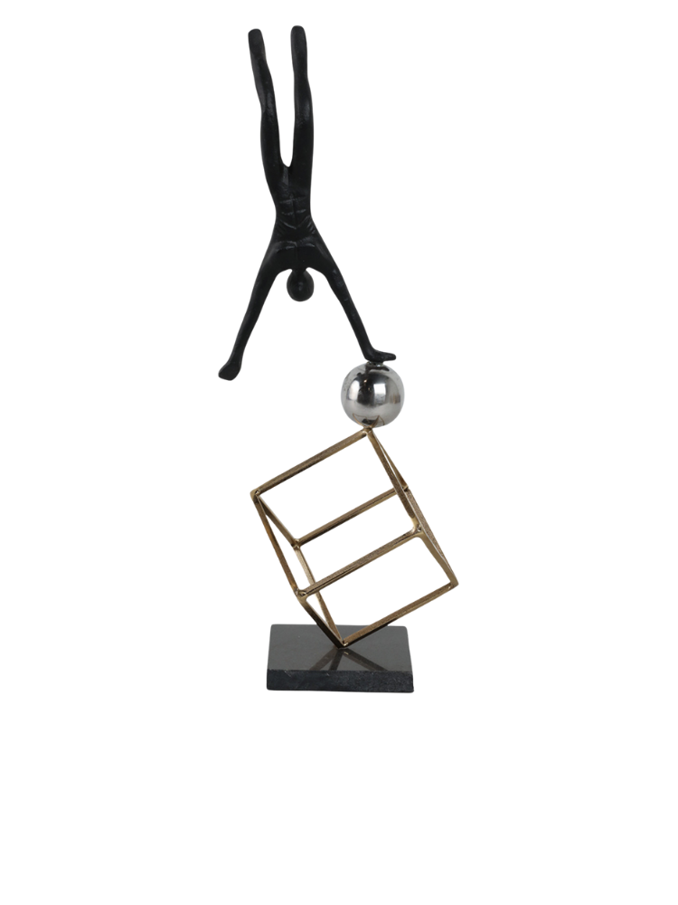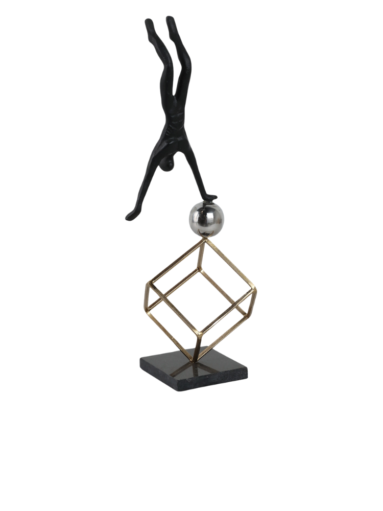 La escultura representa a un gimnasta en una pose de equilibrio invertida. La figura está hecha de metal con un acabado oscuro, posiblemente negro, y se apoya sobre una esfera brillante de color plateado. La esfera, a su vez, está sostenida por una estructura cúbica de metal en tono dorado. Toda la pieza se asienta sobre una base sólida y oscura. Las imágenes muestran la escultura desde dos ángulos diferentes, destacando su equilibrio y diseño moderno.