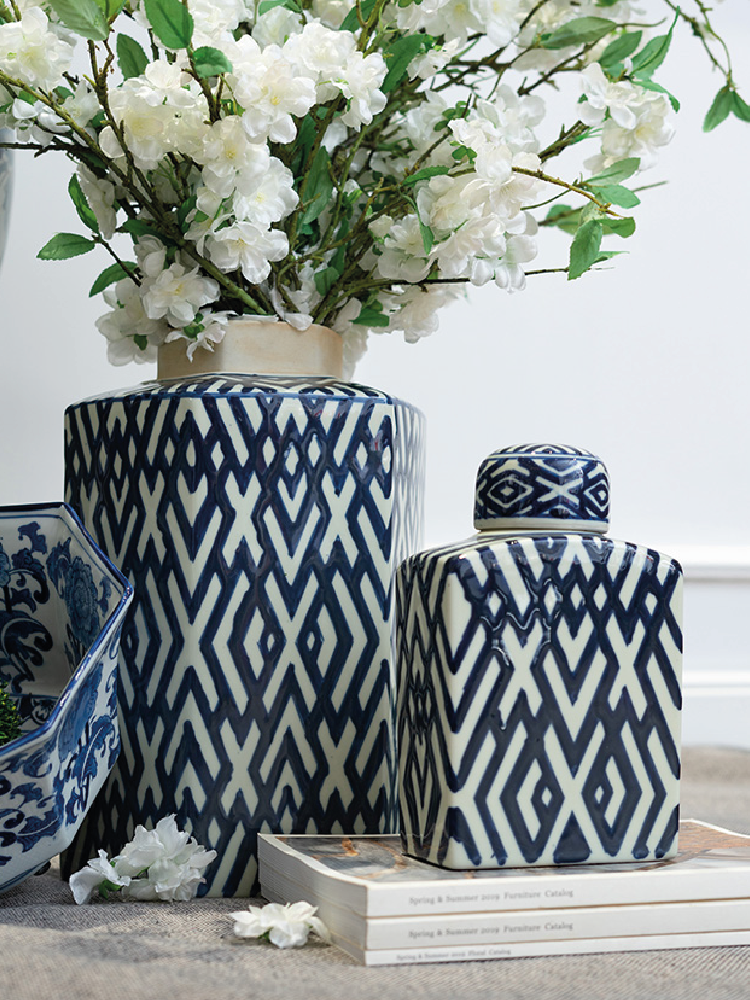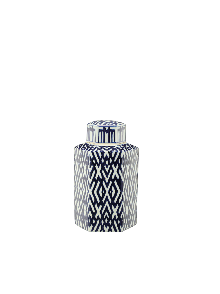 Nuestra ánfora de cerámica combina la elegancia del blanco y el azul con un diseño geométrico de líneas en forma de rombos. Esta pieza única y encantadora añade un toque de estilo y funcionalidad a cualquier espacio. Con su tapa, puede utilizarse tanto como elemento decorativo como para almacenar pequeños objetos.