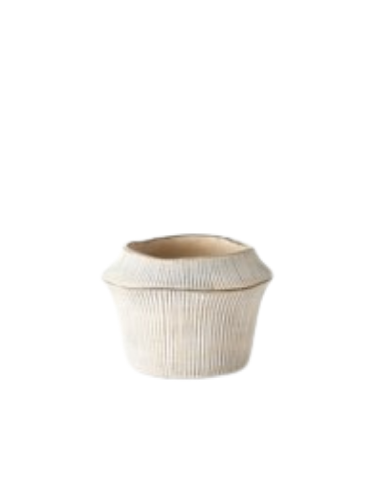 Este jarrón está hecho de cemento con un acabado de color natural y detalles de pátina antigua. La pieza tiene una forma orgánica y curvas suaves, y presenta un diseño de líneas verticales acanaladas que le dan una textura única y hecha a mano. Con unas dimensiones de 11.25" de alto x 7" de ancho x 7" de profundidad, es ideal para usarlo como jarrón decorativo o para sostener arreglos florales.