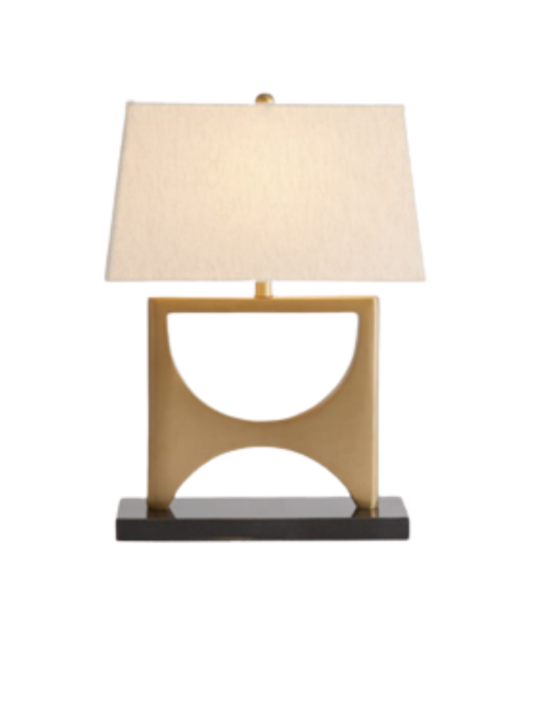 Esta lámpara de mesa es una pieza decorativa con un diseño moderno y refinado. Cuenta con una base rectangular de granito negro que sostiene una estructura geométrica de aluminio con un elegante acabado en latón envejecido. La pantalla de lino, de forma rectangular, tiene un color avena que complementa perfectamente la base y el cuerpo de la lámpara. Este objeto combina el estilo moderno de sus líneas limpias con un toque clásico, lo que lo hace ideal para cualquier espacio, desde una sala de estar hasta una oficina. La lámpara usa una bombilla de 60W y tiene un cordón de 8 pies con un interruptor giratorio.