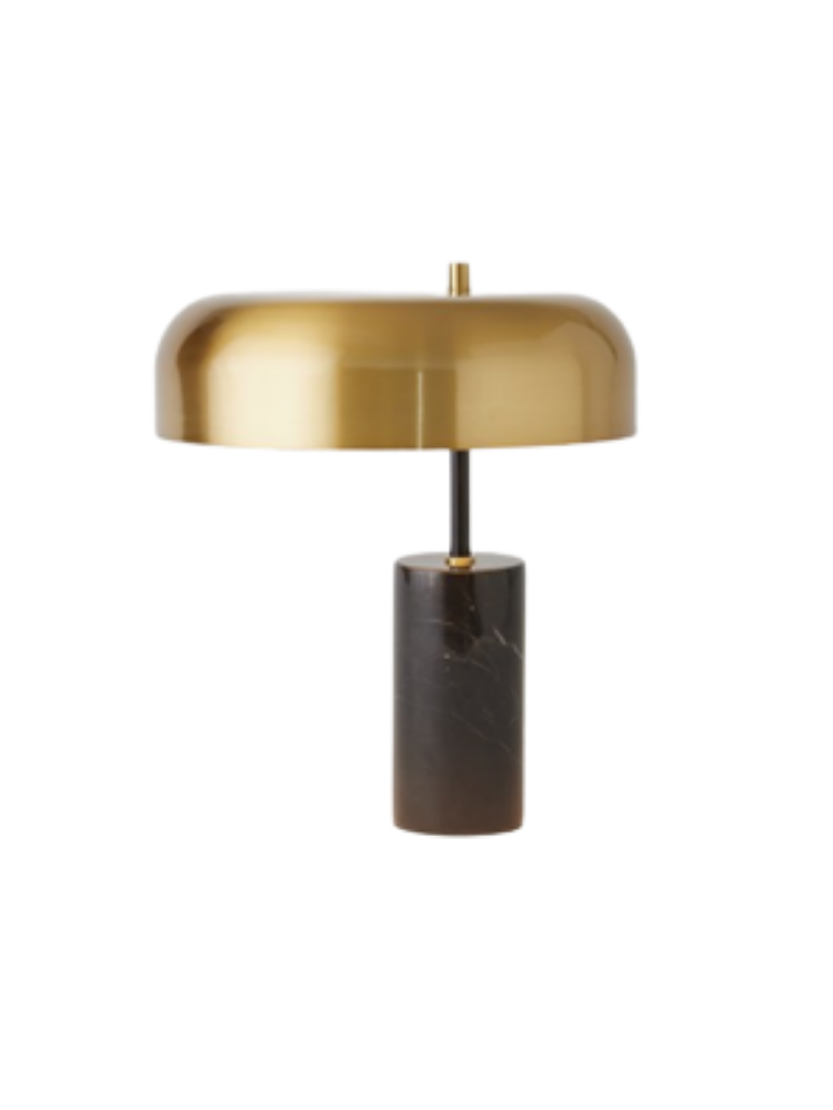 Esta lámpara de mes presenta un diseño contemporáneo y elegante. La lámpara tiene una silueta esbelta con una base cilíndrica de mármol negro sólido, que contrasta con la pantalla de metal en forma de cúpula con un acabado dorado cepillado. Un fino soporte de hierro con un acabado negro une la pantalla y la base. La combinación de los materiales y los colores le da a la lámpara un aspecto sofisticado y la hace ideal para decorar una mesa auxiliar, un escritorio o una mesita de noche. La lámpara usa una bombilla de 60W y tiene un interruptor en el cable.