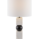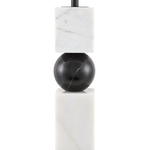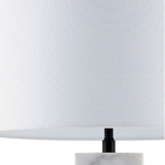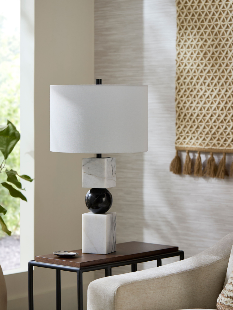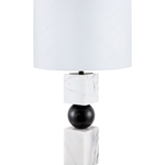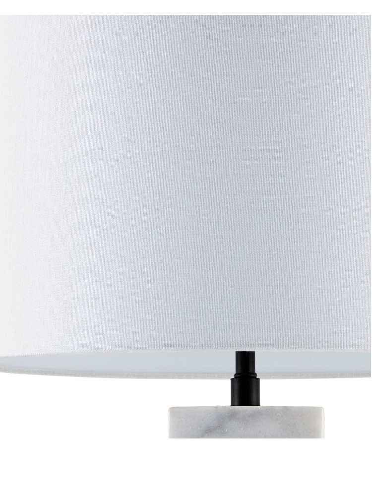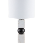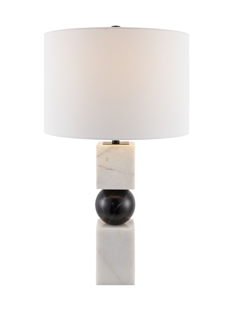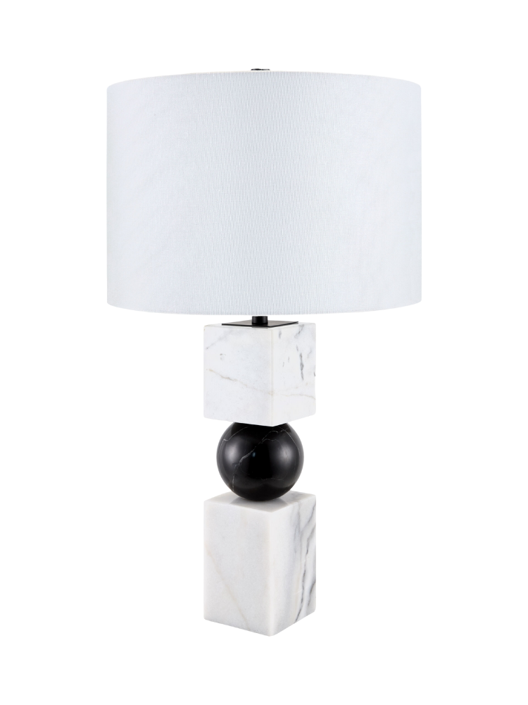 Esta lámpara de mesa de acento destaca por su base escultórica y moderna, compuesta por bloques de mármol. La base presenta un diseño geométrico, apilando dos bloques: uno superior de mármol claro con acabado natural, y uno inferior de mármol oscuro con acabado en negro natural. La pantalla de lino y poliéster de color blanco, de forma rectangular, complementa la base de manera minimalista y elegante. El diseño general es sofisticado y aporta un toque de lujo sutil a cualquier espacio.