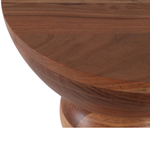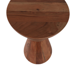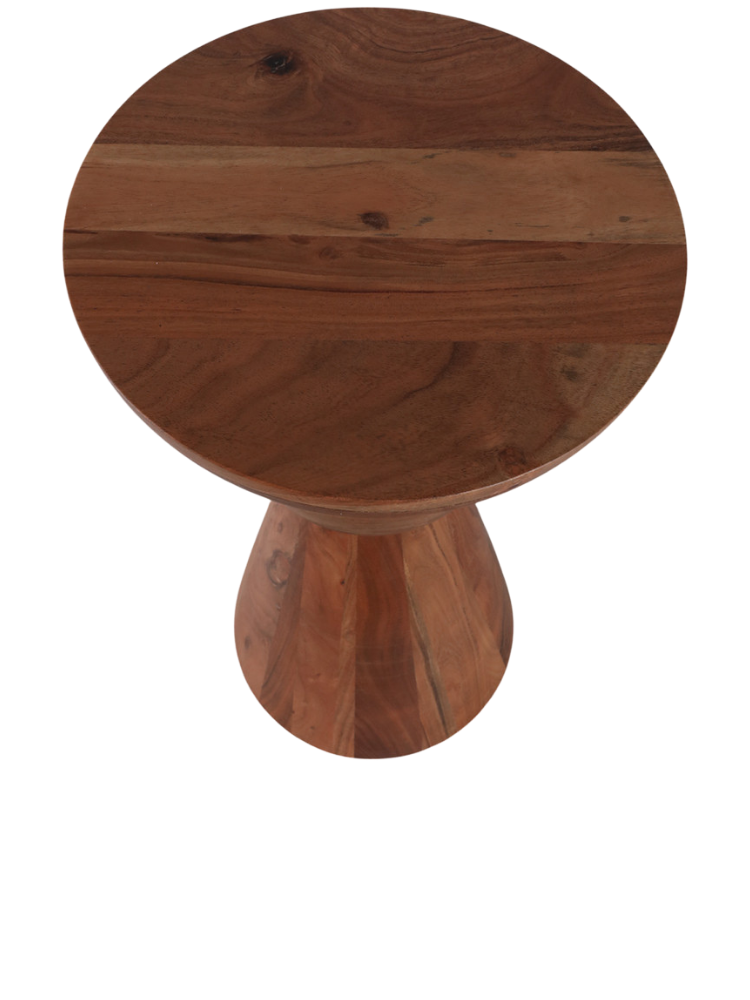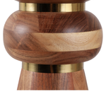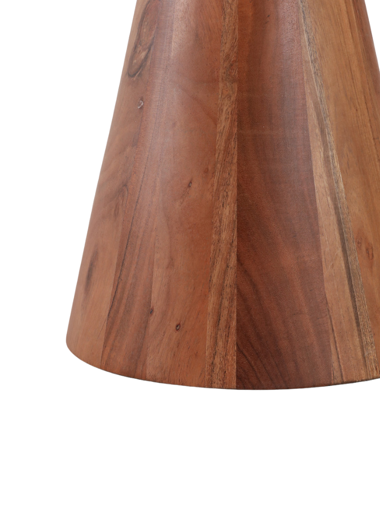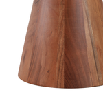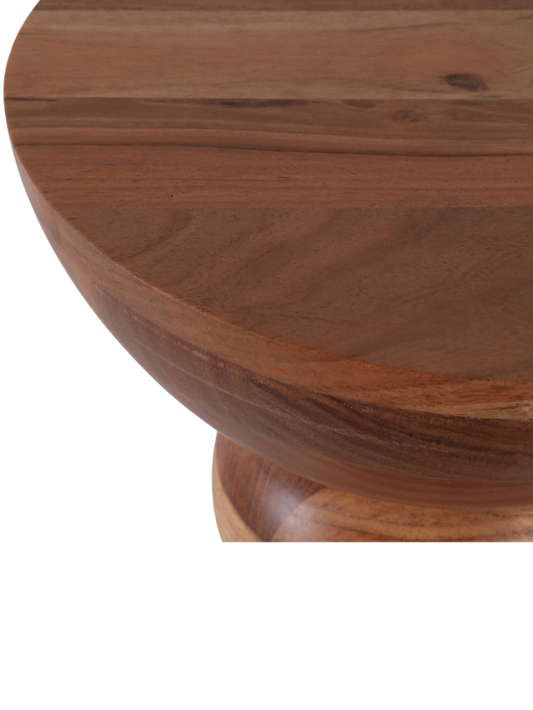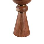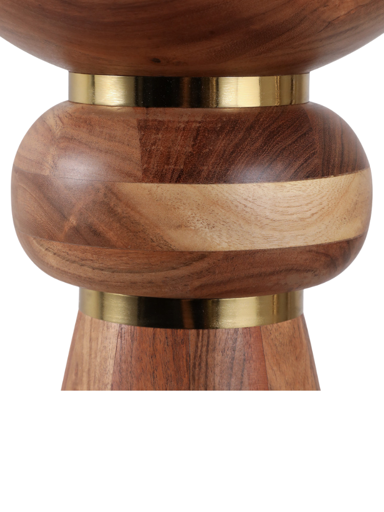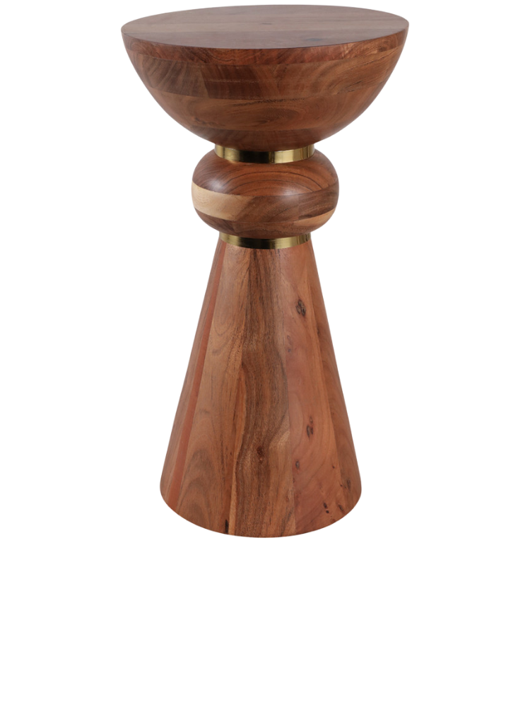 Esta mesa de coctel de madera se distingue por su diseño escultural y moderno. La pieza presenta un acabado natural que resalta las hermosas vetas de la madera, creando un aspecto cálido y orgánico. Su silueta única está formada por distintas secciones redondas, unidas por detalles dorados que le dan un toque de elegancia. Es el complemento perfecto para cualquier sala de estar, añadiendo un acento decorativo que es a la vez funcional y una verdadera obra de arte.