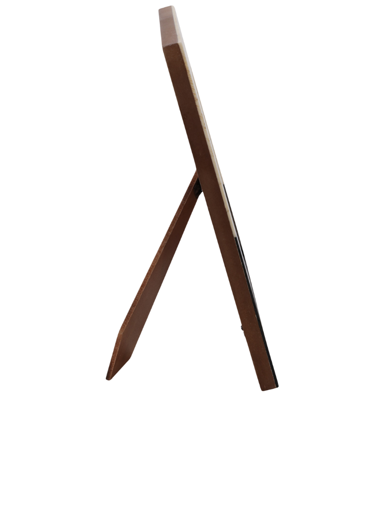 Se muestra un portarretratos de 4x6 con un diseño de dos tonos, marfil y negro. El marco tiene una base negra en la parte inferior, sobre la cual se asienta una sección superior de color marfil. Esta sección marfil presenta un sutil patrón de espiga. La combinación de estos dos tonos le da un aspecto moderno y elegante. Las imágenes del producto lo muestran tanto de frente como de lado, donde se puede ver el soporte para colocarlo en una superficie plana.