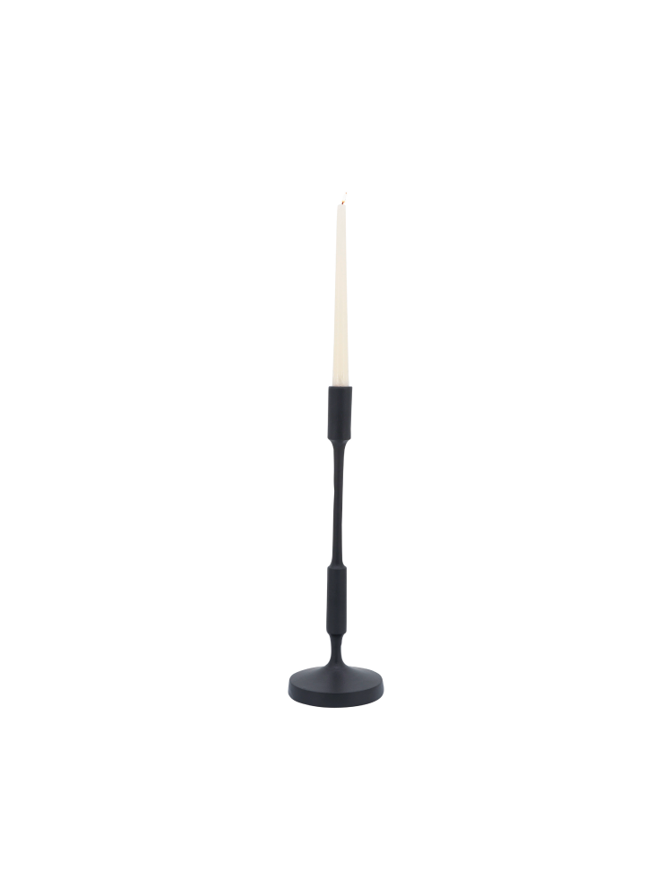 Este candelabro esbelto de acabado mate y textura rugosa, destaca por su estilo único y contemporáneo.