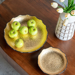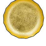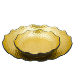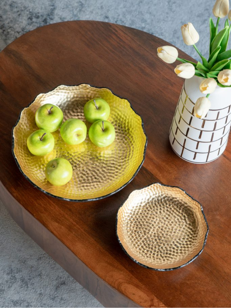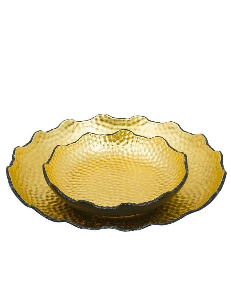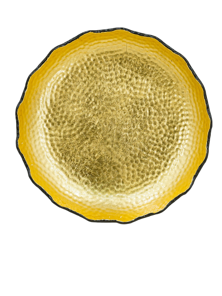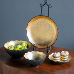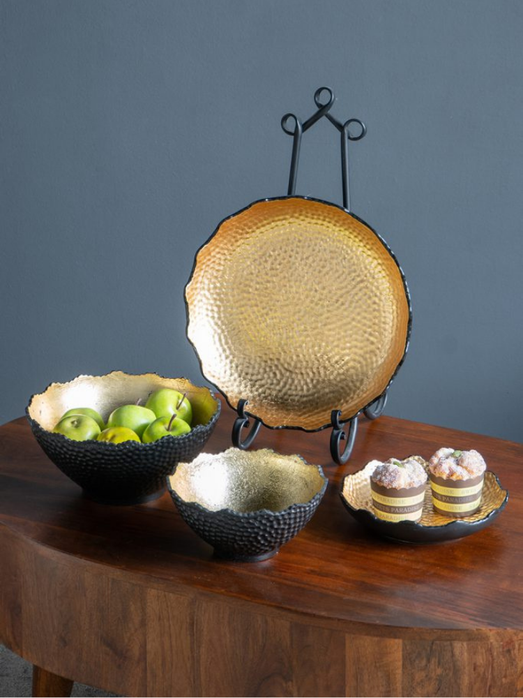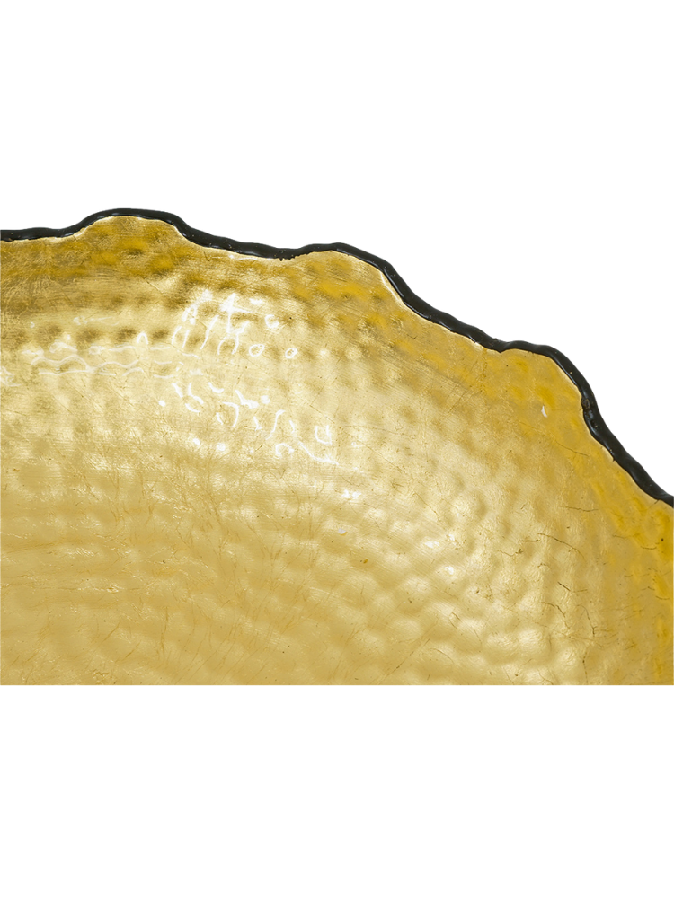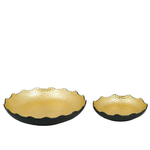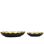 Este es un set de dos platos decorativos elaborados magistralmente en cerámica de alta calidad. Cada plato presenta un elegante contraste con un acabado en negro en la superficie interior y un impactante baño de oro (Gilded) que recubre el exterior y el distintivo borde ondulado. Su lujoso acabado dorado de dos tonos asegura que la pieza atraiga la atención.
