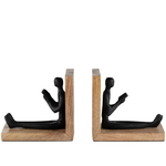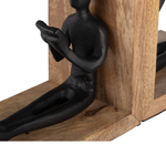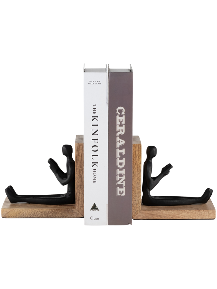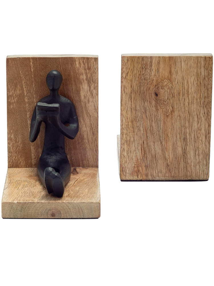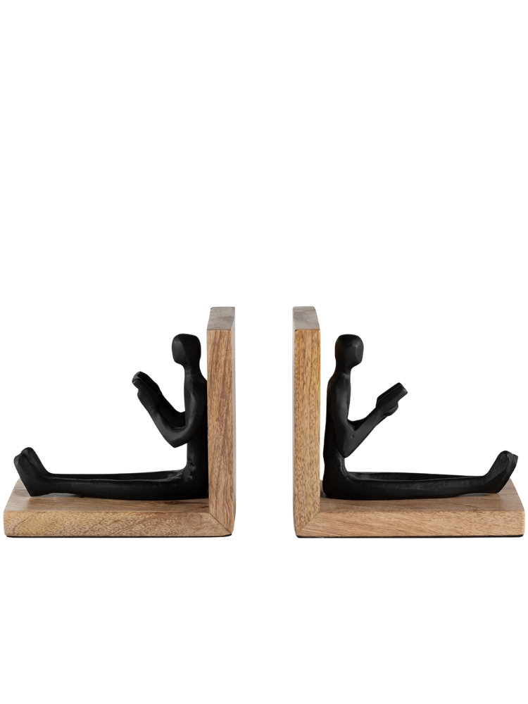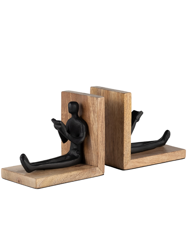 Este par de sujetalibros decorativos fusiona funcionalidad con un diseño artístico y relajante. Cada pieza presenta una figura de metal negro que representa a una persona absorta en la lectura. La figura descansa sobre una base de madera natural, creando un contraste cálido y moderno. Ideal para los amantes de los libros, este accesorio no solo organiza tus volúmenes favoritos, sino que también añade un toque personal y sereno a cualquier estantería, escritorio o espacio de lectura.